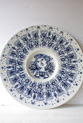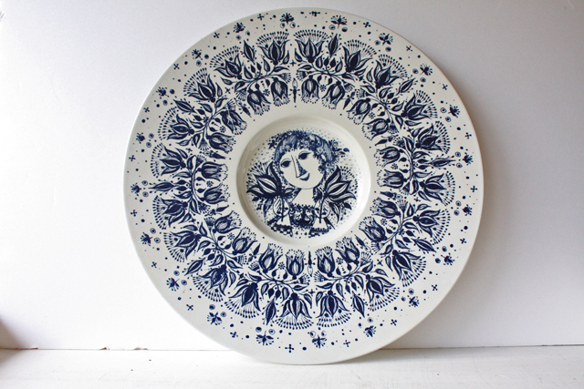 デンマークの人気デザイナーBjorn Wiinblad(ヴョルン・ウィンブラッド)の美しい絵皿です。女性が両手にお花を持って微笑んでいます。単色ながら、ヴィンブラッドならではの華やかさがあります。Φ30センチの大きなサイズで、存在感がありインテリアの主役となるような迫力があります。壁に飾れるようにヒモを通す穴が開いています。