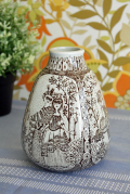 デンマークの国民的人気アーティスト/Bjorn Wiinblad(ヴョルン・ウィンブラッド)のフラワーベースです。当店初入荷のデザインで、柔らかな曲線の多角形フォルムが魅力です。仮面舞踏会がモチーフとなっており、着飾った男女や道化師、楽器を演奏する人など様々な登場人物が描かれています。ヴィヨルンならではの繊細な描写で描かれた衣装や風景など色とりどりの様子が思い描けてきます。