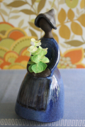スウェーデン、jie gantofta社製の陶器の花瓶です。女性の組んだ両手の間に穴があいており、そこにお花をさすと女性がお花を抱えているようにみえる素敵なデザインです。ドレスや帽子にはツヤのある釉薬がかけられており、顔や手など素肌にはマットな素地のままという対比が温かな雰囲気を醸しています。