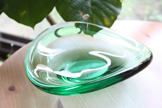 デンマークの王室御用達ブランド、Holmegaardのガラスボウルです。爽やかなクリアグリーンに柔らかなウェーブが美しい作品です。オブジェとして飾っても素敵でしょう。