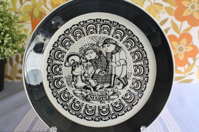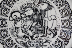 デンマークの人気デザイナーBjorn Wiinblad(ヴョルン・ウィンブラッド)の美しい絵皿です。こちらは、マンスリープレートで12か月のシリーズになっています。3月のプレートは、まだ寒い北欧の春に、マフラーやコートを着た親子が小さなお花を摘んでいる場面が描かれています。細かく描かれた、ヴィヨルンの図柄には温かな雰囲気が漂います。