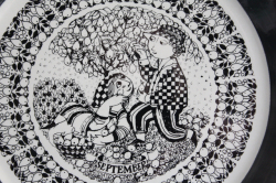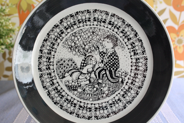 デンマークの人気デザイナーBjorn Wiinblad(ヴョルン・ウィンブラッド)の美しい絵皿です。こちらは、マンスリープレートで12か月のシリーズになっています。10月のプレートは、たわわに実った果樹園でリンゴを摘む男女が描かれています。細かく描かれた、ヴィヨルンの図柄には温かな雰囲気が漂います。