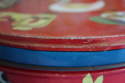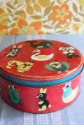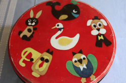 デンマークで見つけたヴィンテージ缶です。フェルトで作られた動物たちのアップリケがプリントされています。ノスタルジックで懐かしい雰囲気は、小物入れとしてお使いいただいたりディスプレイとしても素敵でしょう。アップリケがモチーフのなかなか見かけないデザインです。ハンドメイドをされる方のお裁縫箱として使われても、愛らしくてとっても可愛らしいです。