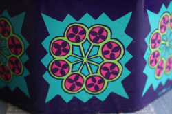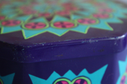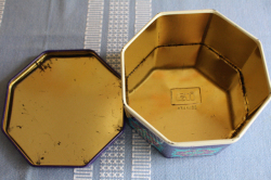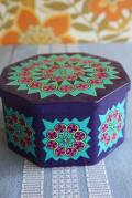 デンマーク、Ira社のヴィンテージ缶です。落ち着いたパープル地にローズやグリーンの華やかな配色で幾何学模様がデザインされています。六角で小ぶりなので、お部屋に飾っておくだけでも存在感のある素敵な缶です。