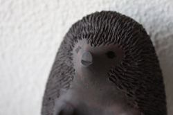 デンマーク、エレン・カールセンデザインのハリネズミのお母さんです。当店でお取り扱いしているハリネズミ(子供)の大きなバージョンです。とても美人で優しい目のお母さんです。こちらは水を飲んでいる様子をデザインしているので、入れ物に口を付けるようなフォルムとなっています。画像は、表情などが分かりやすいので、もたれ掛けさせて立たせています。