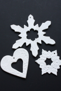 デンマーク、Finnsdottirのオーナメントセットです。小さな工房で一つ一つ手作りで作られた温かみのある作品は老若男女問わず人気があり、デンマークのインテリア雑誌などにも取り上げられています。真っ白で素朴な素焼きの作品はオーナメントの形はもちろん、ベースの生地に型押しのモチーフが入っていますのでとってもかわいいです!雪の結晶、バンビの型抜きなどどの形も可愛くてクリスマスのシーズンにピッタリの作品です。窓際に飾ってお楽しみ下さいね。