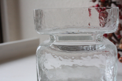 フィンランド/Riihimaen lasi社のPalaシリーズの花瓶です。こちらは同社で活躍したデザイナーHelena Tynellによるもので、様々なカラーや大きさがあることで知られています。今回入荷分は、クリアガラスで大きなサイズです。飽きのこない今もガラスのコレクターに人気のあるベースです。クリアなので、お花を選ばず引き立ててくれるでしょう。表面が波打ったように作られているのでガラスなのに表情がある素敵な雰囲気です。大サイズで使い勝手がよく、これからも長く使っていただけるコンディションです!