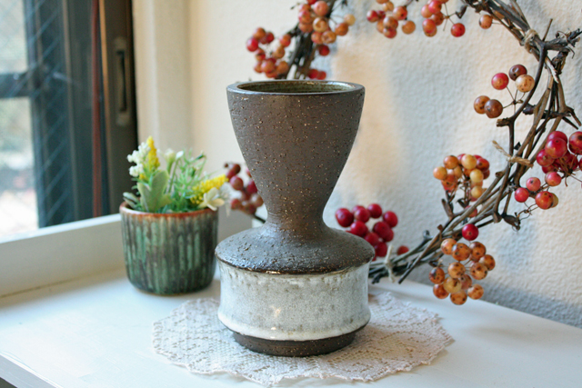 デンマーク、Michael Andersen & Son社の花瓶です。粗い土の質感を残す素焼きの部分と柔らかなミルクホワイトの釉薬のコントラストが美しいデザインです。和の雰囲気漂う落ち着いた佇まいは、和室などにおいていただいても素敵でしょう。