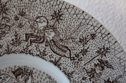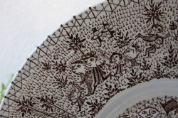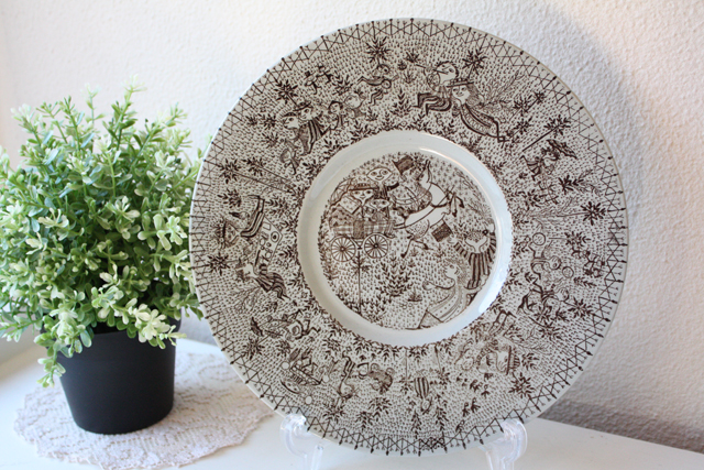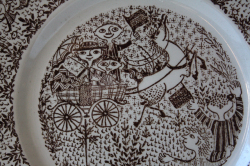 デンマークの国民的人気デザイナーBjorn Wiinblad(ヴョルン・ウィンブラッド)の楽しい絵皿です。公園での楽しげな風景がデザインされています。野原で寝転んでくつろぐカップル、犬を散歩する人、ヴァイオリン弾きがいたり、ボートで川遊びをする家族などデンマークの公園で見かける穏やかな一日が描かれた優しい雰囲気のプレートです。