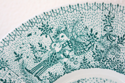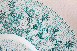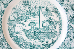 デンマークの国民的人気デザイナーBjorn Wiinblad(ヴョルン・ウィンブラッド)の楽しい絵皿です。公園の水辺で楽しむ人々の風景がデザインされています。ボートに乗る家族、語らう恋人たち、バイオリンの弾き語り、駆け回る子供たち、デンマークの公園で見かける穏やかな一日が描かれた優しい雰囲気のプレートです。当店初入荷のグリーンのご紹介です。