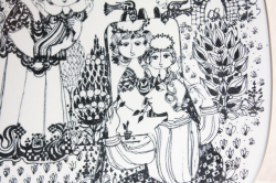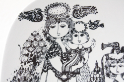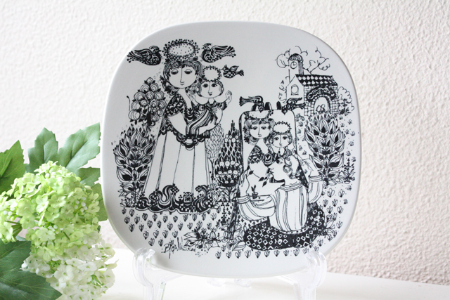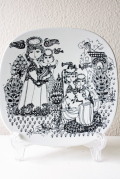 デンマークの人気デザイナーBjorn Wiinblad(ヴョルン・ウィンブラッド)の美しい絵皿です。裏面にはデンマークの蓄音機メーカー、Hede Nilsen社の社名と年度が記されており、ノベルティプレートとして作られたようです。美しい妻と娘をモデルにして絵をかくお父さんを描いたほのぼのとした図柄です。絵皿として飾っていただくと繊細なヴィヨルンの世界を楽しめます。市場でもあまり見かけないレアなプレートです。