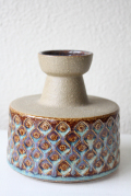 デンマークの小さな島(ボーンホルム島)に1835年から1996年まで存在した陶器メーカーSoholm(スーホルム)のフラワーベースです。ぽってりとした厚みと安定感のあるフォルムに、側面には丸い模様がエンボスにデザインされています。その凹凸に釉薬がかかり味わいある表情を浮かべています。お花を生けても、オブジェとして飾っても素敵でしょう。