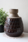 デンマークの小さな島(ボーンホルム島)に1835年から1996年まで存在した陶器メーカーSoholm(スーホルム)のフラワーベースです。ぽってりとした厚みと安定感のあるフォルムに、側面にはクサビ模様がエンボスにデザインされています。その凹凸に釉薬がかかり味わいある表情を浮かべています。大きなサイズで存在感もあり、お花を生けてもオブジェとして飾っても素敵でしょう。