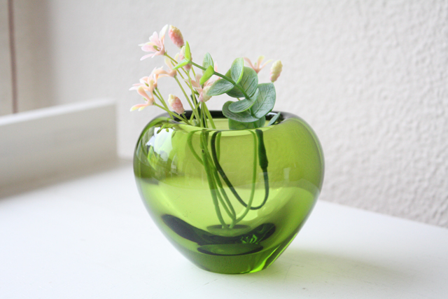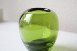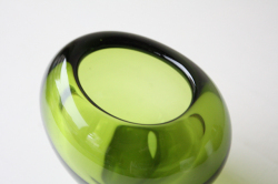 デンマークの王室御用達ブランド、Holmegaardのガラスボウルです。落ち着いたモスグリーンに柔らかなウェーブが美しい作品です。小さな野花を生けたり、オブジェとして飾っても素敵でしょう。ガラスは滑らかで、品質の高さを感じる素敵な作品です。