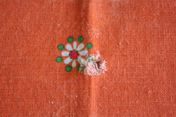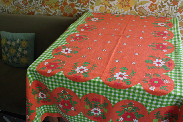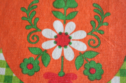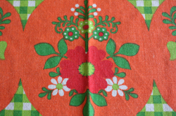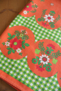 デンマークで見つけたヴィンテージクロスです。グリーンとオレンジの元気な配色で、食卓を明るく演出できますね。中央部分に1か所ほころびがありますが、繕って頂ければ生地もしっかりとしており実用として十分にお使いいただけます。お部屋がぱっと明るくなる可愛らしいクロスです。室内だけでなく、お庭やベランダなど屋外でのティータイムに使っていただいても素敵ですね。お天気の良い日には思い切って、アウトドア用として、芝生や海辺に広げて使って頂くのもカラフルでお勧めです!