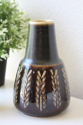 デンマークの小さな島(ボーンホルム島)に1835年から1996年まで存在した名窯Soholm(スーホルム)のフラワーベースです。柔らかな曲線のフォルム、落ち着いたブラウンに植物がデザインされています。ツヤノある釉薬のかけられた側面と、上部のマットな質感との対比が美しい佇まいです。