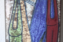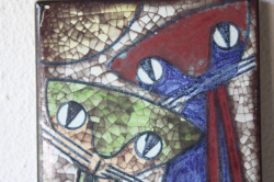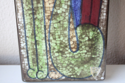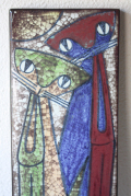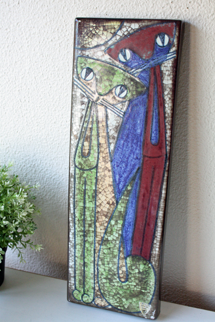 デンマークのMichael Andersen & Son社の陶板の壁掛けです。デザインは数々の女性らしい柔らかな作品を生み出したMarianne starckになります。こちらの作品は、カラフルな猫がモチーフで釉薬を貫入に染み込ませ個性的な仕上がりになっています。40cm弱の長さで大きめの陶板ですので、とても存在感があります。こちらはドイツ/ブリュッセルの世界万博で金賞を受賞したPersia Techniqueと呼ばれる貫入による独特の技法が使われています。市場でもあまり見かけない珍しい作品です!
