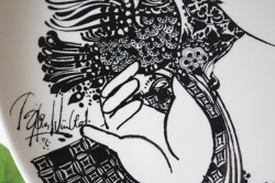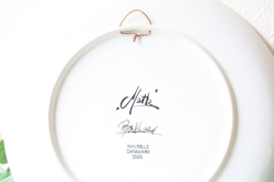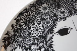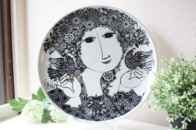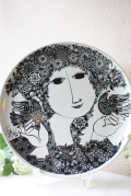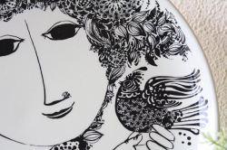 デンマークの国民的人気デザイナーBjorn Wiinblad(ヴョルン・ウィンブラッド)の美しい絵皿です。美しい貴婦人が華やかな飾りのついた帽子を付け、トリと戯れている場面が繊細に描かれています。絵画のように美しいヴィヨルンの世界を堪能できる作品です。こちらは当店初入荷のデザインで、大判なのでお部屋のアクセントとしておススメです。