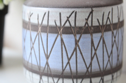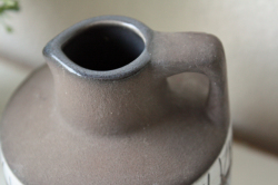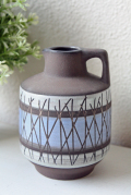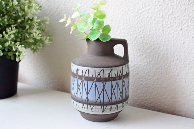 ドイツ製のヴィンテージ花瓶です。持ち手付きのどっしりと安定感のあるフォルムに幾何学模様がデザインされています。優しいライトブルーのお色が魅力的な作品です。一輪挿しとして小さなお花を飾っていただくとよいでしょう。