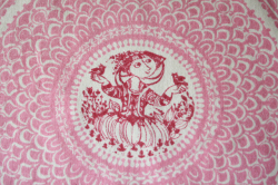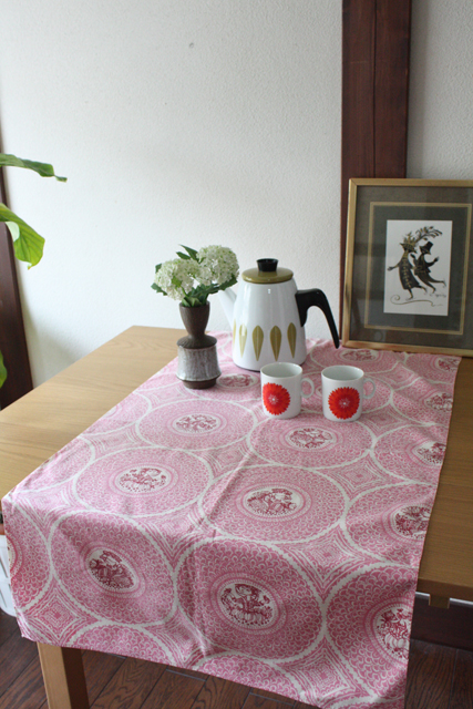 デンマークの国民的人気アーティスト、Bjorn Wiinbladデザインのクロスです。ヴィヨルンならではの、ち密で繊細なデザインが魅力です。丸の中に異なった女性の図柄が描かれており、クロスとしてだけでなく、リメイクしてクッションなどにしても可愛いですね。
