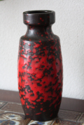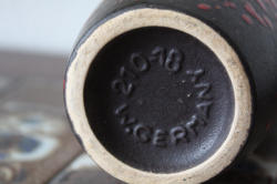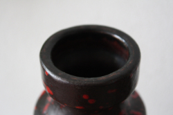 西ドイツ製のヴィンテージ花瓶です。マットなブラックの釉薬の上から赤い釉薬をランダムに振り掛けたユニークなデザインです。シックでモダンな雰囲気はチークの家具などとも相性がよいでしょう。いくつか花瓶を集めて並べても素敵ですね。