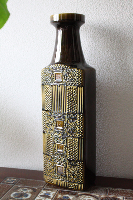 デンマークで見つけたドイツ、BAY社製のヴィンテージ花瓶です。こちらは、特大サイズで、高さが40cmあり、床に直置きしていただいても十分な高さと存在感がありおススメです。ブラウンとモスグリーンが混じったような複雑なお色で、落ち着いた味わいのある雰囲気は長くご愛用いただけるでしょう。大きなサイズなので、枝ものを生けていただくのも素敵ですね。