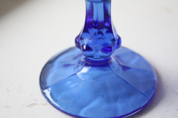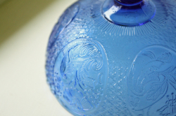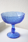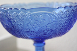 デンマークで見つけたガラスの足つきボウルです。足つきの優雅なフォルムに、お花や幾何学模様が側面いっぱいにデザインされています。クリアブルーの優しい雰囲気で、お菓子やデザートなど盛り付けるのにぴったりなお品です。
