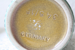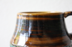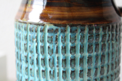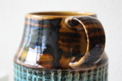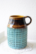 ドイツ製のヴィンテージ花瓶です。持ち手付きのどっしりと安定感のあるフォルムにストライプがデザインされています。ターコイズブルーとライトブラウンの組み合わせは若々しく、お部屋を明るくしてくれるでしょう。