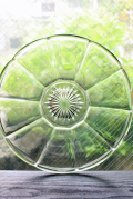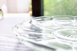 デンマークの王室御用達ブランド、Holmegaardのガラスプレートです。こちらは1930年代に製作されたものですが、古さを感じさせないデザインです。お花がモチーフになっていて、花びらの縁が少し反りあがるようになっています。肌さわりは滑らかで質の高さを感じさせます。カットフルーツやカルパッチョなど、涼しげな演出にいかがでしょうか。