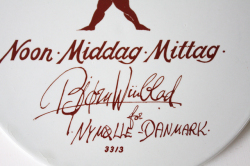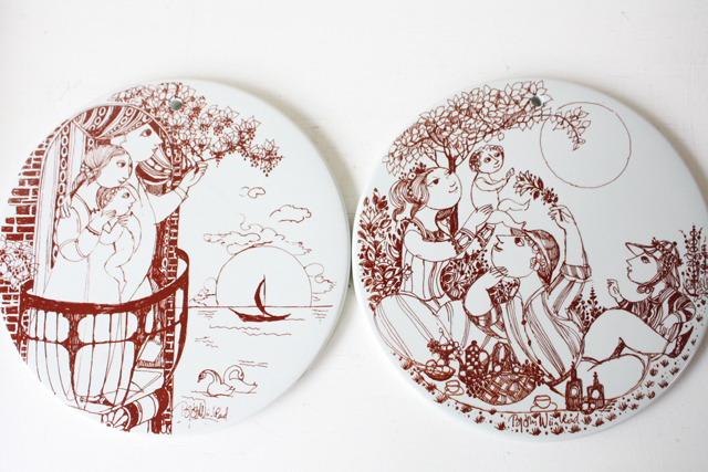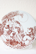 デンマークで人気のアーティスト/Bjorn Wiinblad(ヴョルン・ウィンブラッド)の美しい絵皿です。こちらは家族でピクニックに来ているのでしょうか?赤ちゃんを抱き上げるママ、お花であやすパパ。のどかなお昼のピクニックがモチーフのようです。ライトブラウンの落ち着いたカラーで繊細なタッチで描かれています。