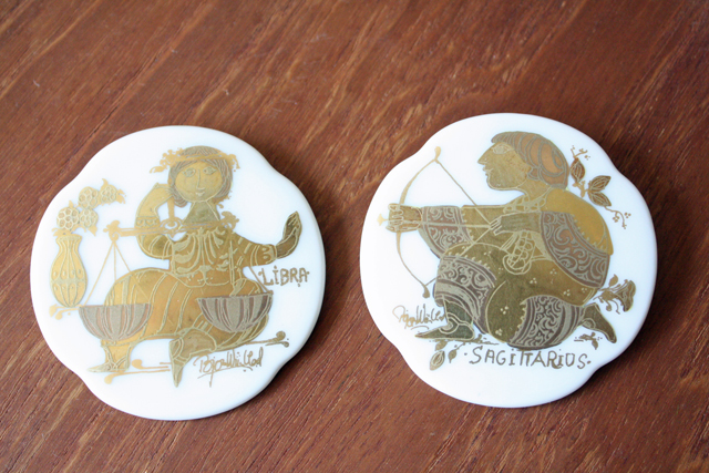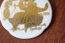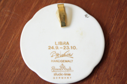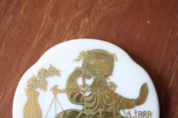 デンマークの人気のアーティスト/Bjorn Wiinblad(ヴョルン・ウィンブラッド)のヴィンテージのブローチです。こちらは陶器で出来ており、金彩でギリシャ神話に出てくるような衣装を身に付けた女性が描かれています。星座シリーズの中の、天秤座になります。金の色を変えて、図柄に表情を与えています。裏面には、ペンダントの紐もしくはチェーンを通す金具が取り付けられています。