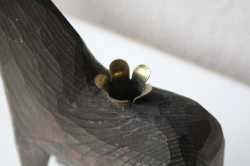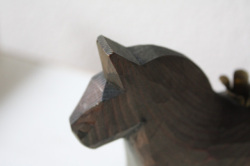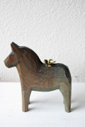 スウェーデン製のダーラナホースです。こちらは、ダーラナヘストの老舗工房ニルスオルソンのもので、背中に真鍮のキャンドルスタンドが取り付けられている珍しいタイプです。ダーラヘスト(スウェーデン語でダーラナ馬という意味)は、18世紀の始め頃、木こりの人たちが 仕事が終わった後に遊び半分に作った木彫りの馬が始まりといわれています。その後この木彫りの馬は、子供達のおもちゃとして自然に定着していき、赤く色が塗られるようになったのは19世紀になってからです。日本ではダーラナホース (スウェーデンの木の馬)という名前で紹介されています。現在はスウェーデンそのものを象徴するものとされています。スウェーデンでは古くから馬は幸せを運んでくれるとされ親しまれています。今回色違いで2体入荷しており、赤いほうにはメーカーのシールが残っていますが、こちらは経年によってとれています。