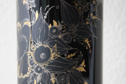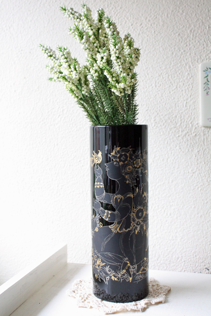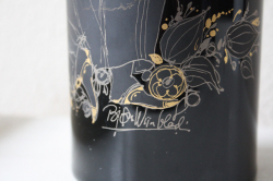 デンマークの人気のアーティスト/Bjorn Wiinblad(ヴョルン・ウィンブラッド)の花瓶です。漆黒の地に金彩でエキゾチックな女性がデザインされています。女性の縁取りの内側はつや消しの黒になっておりメリハリの利いた仕上がりとなっています。オブジェとしても楽しめる存在感のあるお品です。