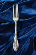 デンマークで見つけたヴィンテージカトラリーです。こちらはアメリカの製フォークになります。1881 Rogersというメーカーで1908年から1917年まで製造された、ブドウのモチーフのデザインです。大変凝った作りで表面には葡萄、裏面には葡萄の葉っぱがデザインされており立体的な造りです。ワインの庭というタイトルで作られた、こちらのメーカーの作品の中でもコレクタブルアイテムとして人気があるカトラリーです。100年以上前に作られたカトラリーが海を渡り、デンマークで使われていたかと思うと不思議な気持ちになりますね。ノスタルジックな雰囲気で、アンティークのお皿と一緒にお料理をサーブして頂けるとより一層雰囲気が、盛り上がりそうですね。