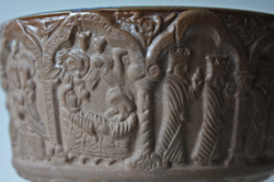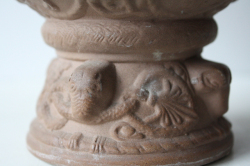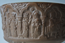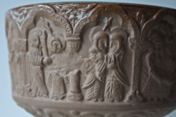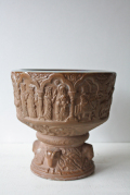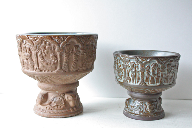 デンマーク、Michael Andersen & Son社の足つきボウルです。日本の高杯のようなフォルムで側面には高貴な方の誕生から没するまでを描いたようなデザインとなっています。下部には不思議な動物の頭が形作られていて、とても凝った造りになっています。内側は聖水を思わせる神秘的なブルーの釉薬がかけられ幻想的な雰囲気を漂わせています。オブジェとして飾っていただくとよいでしょう。どっしりとして、落ち着いたお部屋を演出してくれます。今回入荷分は、とてもきれいなよいヴィンテージコンディションです。向かって左側の大きい方のお品のご紹介です。
