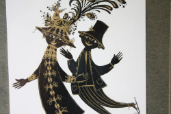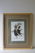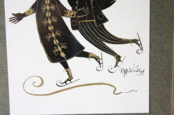デンマークの国民的人気デザイナーBjorn Wiinblad(ヴョルン・ウィンブラッド)の美しい影絵(イラスト)です。ヴョルンといえば絵皿が有名ですが、イラストレーターとしての作品も素晴らしいのです。こちらは影絵に金彩で表情がつけられています。楽しそうにスケートをしているほのぼのとした作品です。