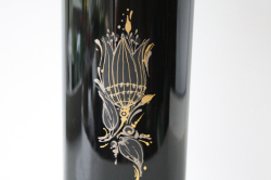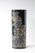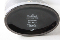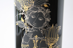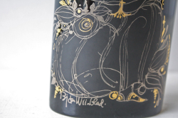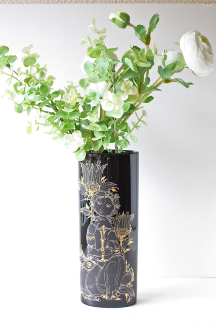 デンマークの人気のアーティスト/Bjorn Wiinblad(ヴョルン・ウィンブラッド)の花瓶です。漆黒の地に金彩でエキゾチックな女性がデザインされています。女性の縁取りの内側はつや消しの黒になっておりメリハリの利いた仕上がりとなっています。オブジェとしても楽しめる存在感のあるお品です。