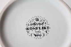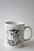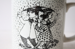デンマークの人気デザイナーBjorn Wiinblad(ヴョルン・ウィンブラッド)のマンスリーマグカップです。こちらのシリーズは1月から12月までの1枚1枚に男女の出会い、結婚、妊娠、出産までを四季を交えながら描いています。4月のテーマは、「KONFLIKT」。雨の中を腕を組んで相合傘をしている男女を描いた場面です。