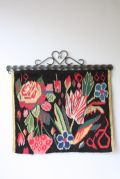 スウェーデン製のフレミッシュ織の壁掛けです。フレミッシュ織は、スウェーデンの中世より伝わるつづれ織りで、椅子の座面やバッグなどに使われてきました。ウールの糸で手間と時間をかけて丁寧に織られた手仕事は、お部屋の温かく彩ってくれるでしょう。こちらのデザインはフレミッシュ織の教則本の中で難易度の高い作品として紹介されています。こちらはチューリップやバラなどの沢山の種類の花で作られたブーケのような作品です。歪みもなく、高い技術で織られたことがわかります。裏面も丁寧に処理がされており、壁に飾れるように燻したメタルの金具が取り付けられています。