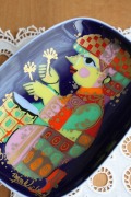 デンマークの人気デザイナーBjorn Wiinblad(ヴョルン・ウィンブラッド)がドイツ・ローゼンタール社のためにデザインした美しい絵皿のシリーズです。こちらは台形のような面白いフォルムの小皿で、楽器を奏でる人が描かれています。カラフルな色使いと背景のネイビーの対比がとても美しいのです。