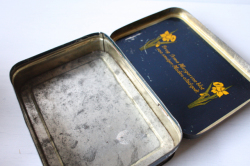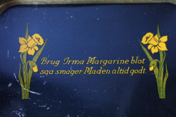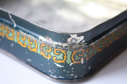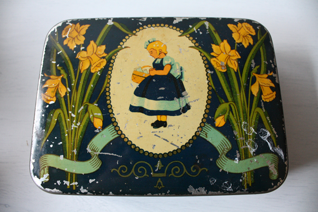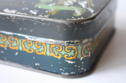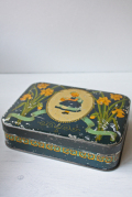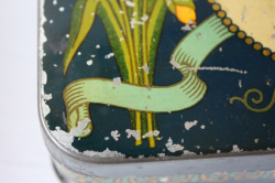 デンマークの高級スーパーIrma(イヤマ)のヴィンテージのスクエア缶です。イメージキャラクターのイアマちゃんがうつむいてたたずんでいます。ブルーのワンピースに、頭には大きなリボン、クラシックで上品ですね。イヤマの缶はデンマークでもコレクターが多いのです。こちらの缶は、今まで入荷したものの中でも特に古い物のようです。製造された時代によって素材の感じが違うのですが、こちらは素材のスチールに重量感がありヴィンテージ缶特有の味わいが感じられます。