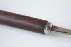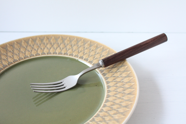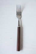 デンマーク製、ヴィンテージカトラリーです。柄の部分はローズウッド材が使われており、ステンレスのシャープさと木の温かさが調和した美しいフォークです。持ち手が丸く温かみのあるデザインです。つるつると滑らかな肌さわりは、北欧の木製品の研磨の技術の高さを感じさせます。