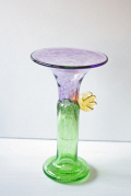 スウェーデン、ボダ社製のヴィンテージガラスのベースです。吹きガラスで作られた透明感のあるパープル、グリーン、イエローの色合い、丸みのあるフォルムは優しげでとても個性的な作品です。※ボダ社は、コスタボダに合併する前のスウェーデンの老舗ガラスメーカーです。バーティル・ヴァリーンは、数々の賞を受賞しており、世界中の博物館にも作品が展示されています。 作品は神秘的、夢のような世界を象徴し表現しています。