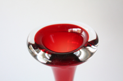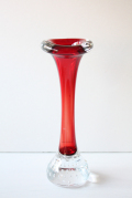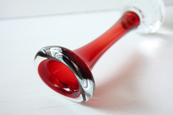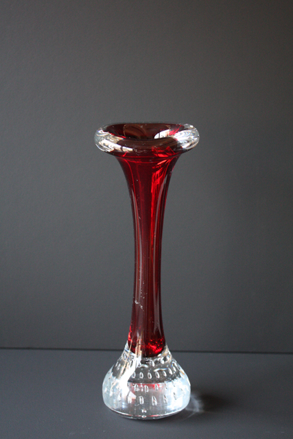 ヴィンテージのスウェーデン製のベースです。こちらはホルムガードの看板デザイナーPer Lutkenの作品でBONEというタイトルが付いています。ほっそりとしたボディに上下は丸みを帯びた個性的なデザインです。足元にはクリアガラスの中に規則的に気泡が入れてあり光にあたってキラキラと輝きます。カラーがいろいろありますので、お部屋のお好みに合わせて飾って頂けます。