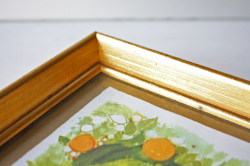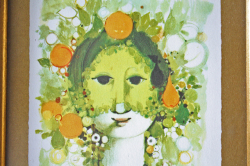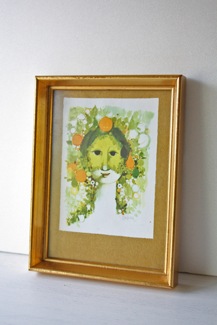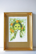 デンマークの国民的人気デザイナーBjorn Wiinblad(ヴョルン・ウィンブラッド)の美しい額絵です。こちらは緑とオレンジの実でしょうか、初夏の雰囲気溢れるデザインが描かれています。個性的な女性の表情が素敵ですね。ヴョルンといえば絵皿が有名ですが、イラストレーターとしての作品も素晴らしいのです。小さなサイズで場所を選ばず飾っていただけるでしょう。