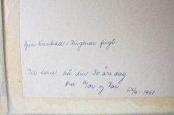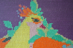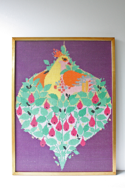 デンマークで見つけた北欧刺繍のフレームです。こちらは、Bjorn Wiinbladデザインの図案で作られています。華やかな色使いながら、背景のバイオレット色が全体を引き締め落ち着いた雰囲気となっています。画面をびっしりと刺繍で覆った手の込んだ作品です。こちらは両親から娘さんに30歳の誕生日に贈られた愛情一杯の作品です。