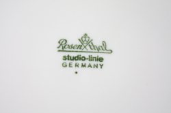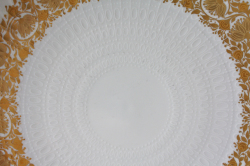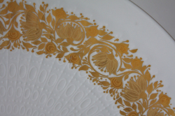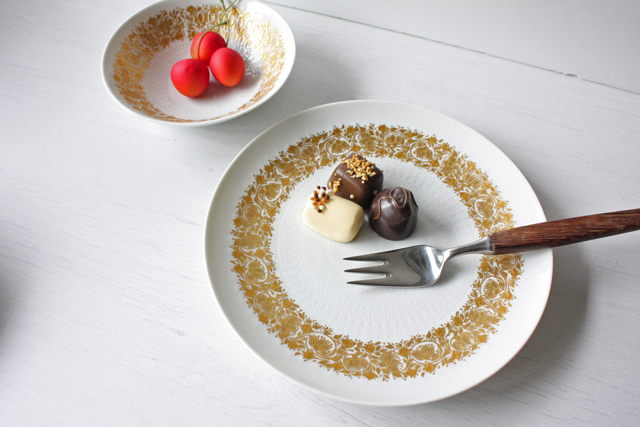 ドイツの一流ブランド、ローゼンタールのケーキ皿です。デザインは、デンマークの有名なアーティストBjorn Wiinbladで真っ白な白磁にエンボスの地模様に豪華な金彩でお花モチーフがデザインされています。燻したような金彩は上品な印象です。