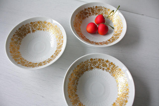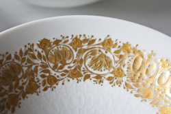 ドイツの一流ブランド、ローゼンタールのミニボウルです。デザインは、デンマークの有名なアーティストBjorn Wiinbladで真っ白な白磁にエンボスの地模様に豪華な金彩でお花モチーフがデザインされています。燻したような金彩は上品な印象です。