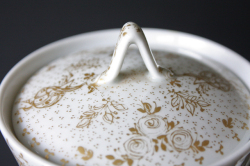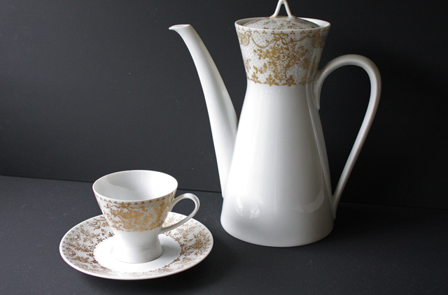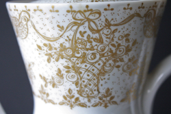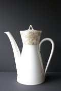ドイツの一流ブランド、ローゼンタールのティーポットです。デザインは、デンマークの有名なアーティストBjorn Wiinbladで真っ白な白磁にヴィヨルンならではの繊細なタッチの花かごや小鳥がデザインされています。薄手のフォルムはに白磁、燻したような金彩は上品な印象です。お揃いでカップ&ソーサー、ケーキプレートもあります。
