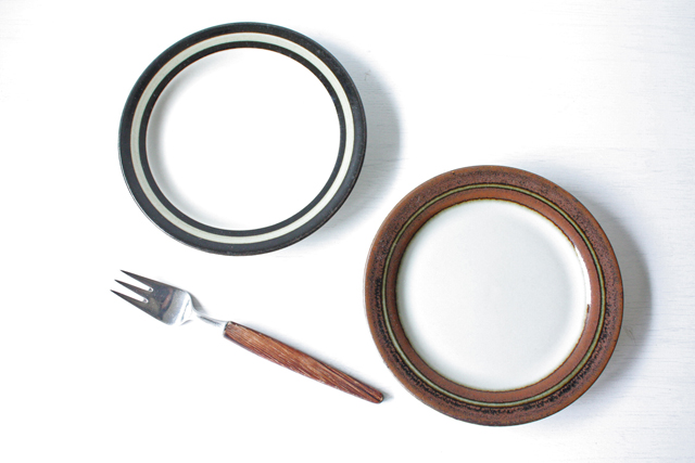 フィンランド、ARABIAのKareliaのケーキプレートです。こちらはシンプルなツートーンのデザインで、万能な使い方が出来そうです。デイリー使いにいかがでしょうか。個々に個性がありますのでお気に入りを見つけてください。向かって左側のプレートのご紹介です。